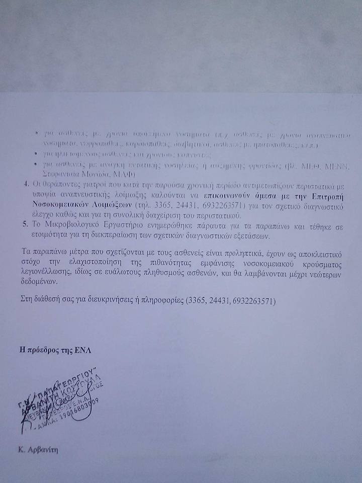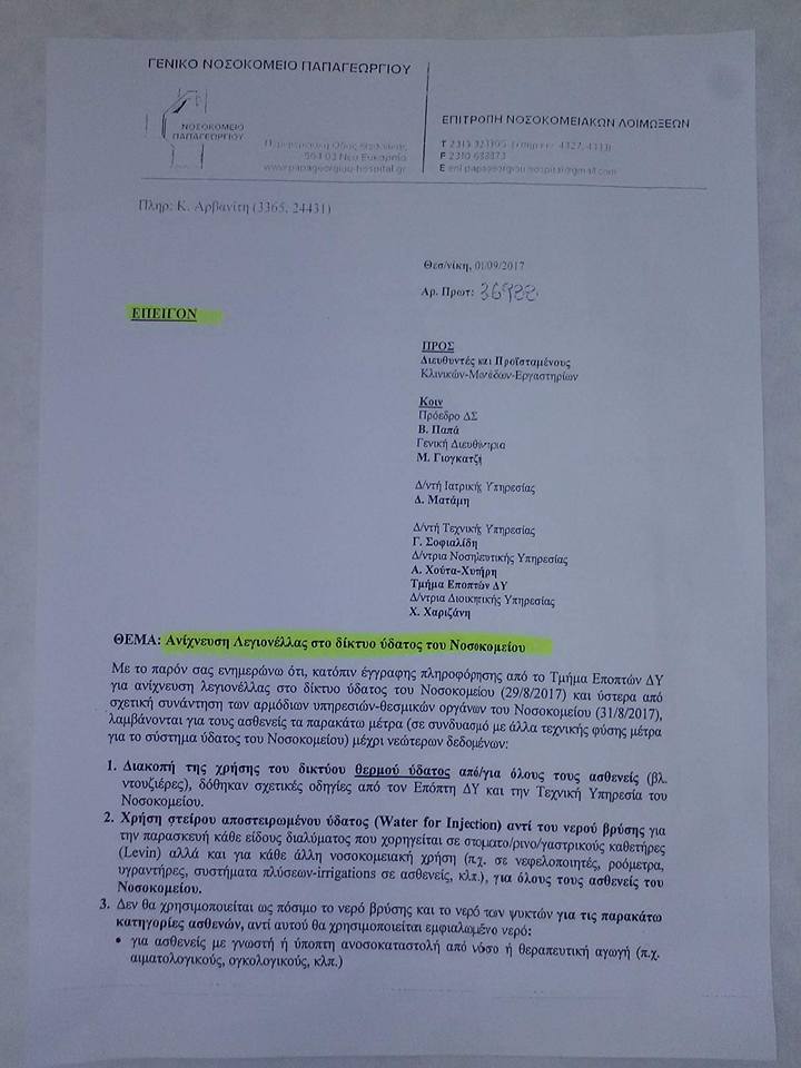 Σας κοινοποιούμε έγγραφο της Επιτροπής Νοσοκομειακών Λοιμώξεων του Νοσοκομείου ΠΑΠΑΓΕΩΡΓΙΟΥ που ενημερώνει για την ανίχνευση λεγιονέλλας στο δίκτυο ύδατος του Νοσοκομείου (29/8/2017) και την λήψη μέτρων για την προφύλαξη ασθενών.