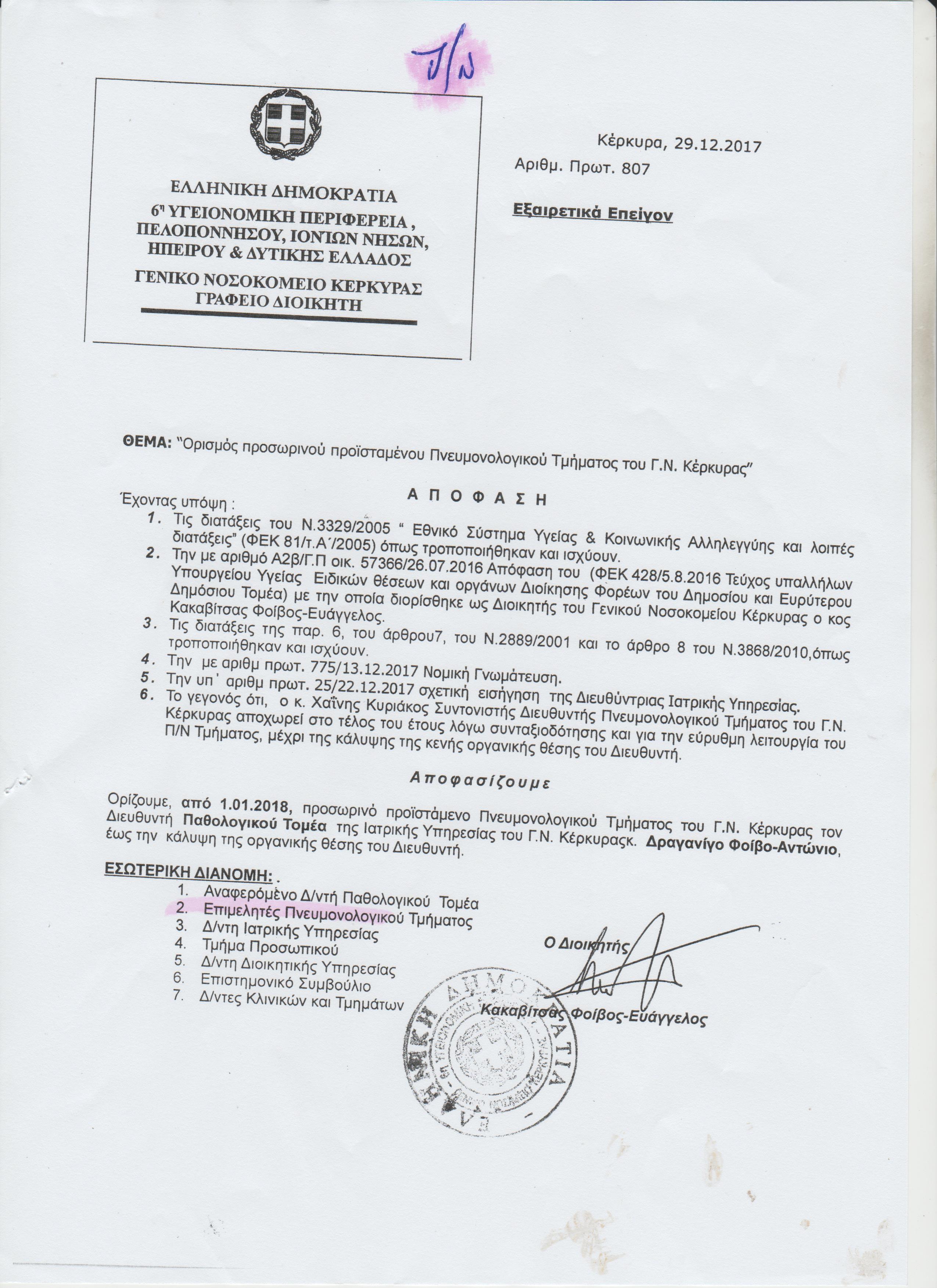 Το Νοσοκομείο ως όφειλε δεν προκήρυξε τη θέση έξι μήνες πριν την συνταξιοδότηση του Διευθυντή, όπως πολλές φορές ζητήθηκε από τον εν λόγο Διευθυντή. Ο Διοικητής με απόφασή του, την οποία σας κοινοποιούμε, όρισε Προϊστάμενο του Πνευμονολογικού Τμήματος τον Διευθυντή Συντονιστή της Καρδιολογικής Κλινικής. Η Πνευμονολογική Κλινική του Νοσοκομείου Κέρκυρας χορηγεί ειδικότητα Πνευμονολογίας στους Ιατρούς και ταυτόχρονα εξυπηρετεί χιλιάδες πολίτες όπως αναλυτικά αναφέρει ο συνταξιοδοτηθείς Διευθυντής Ιατρός στην αναφορά του, την οποία σας κοινοποιούμε. Μάλιστα η Απόφαση του Διοικητή επειδή είναι παράνομη δεν αναφέρει την ειδικότητά του Καρδιολόγου Ιατρού που αναλαμβάνει την Πνευμονολογική Κλινική!!!