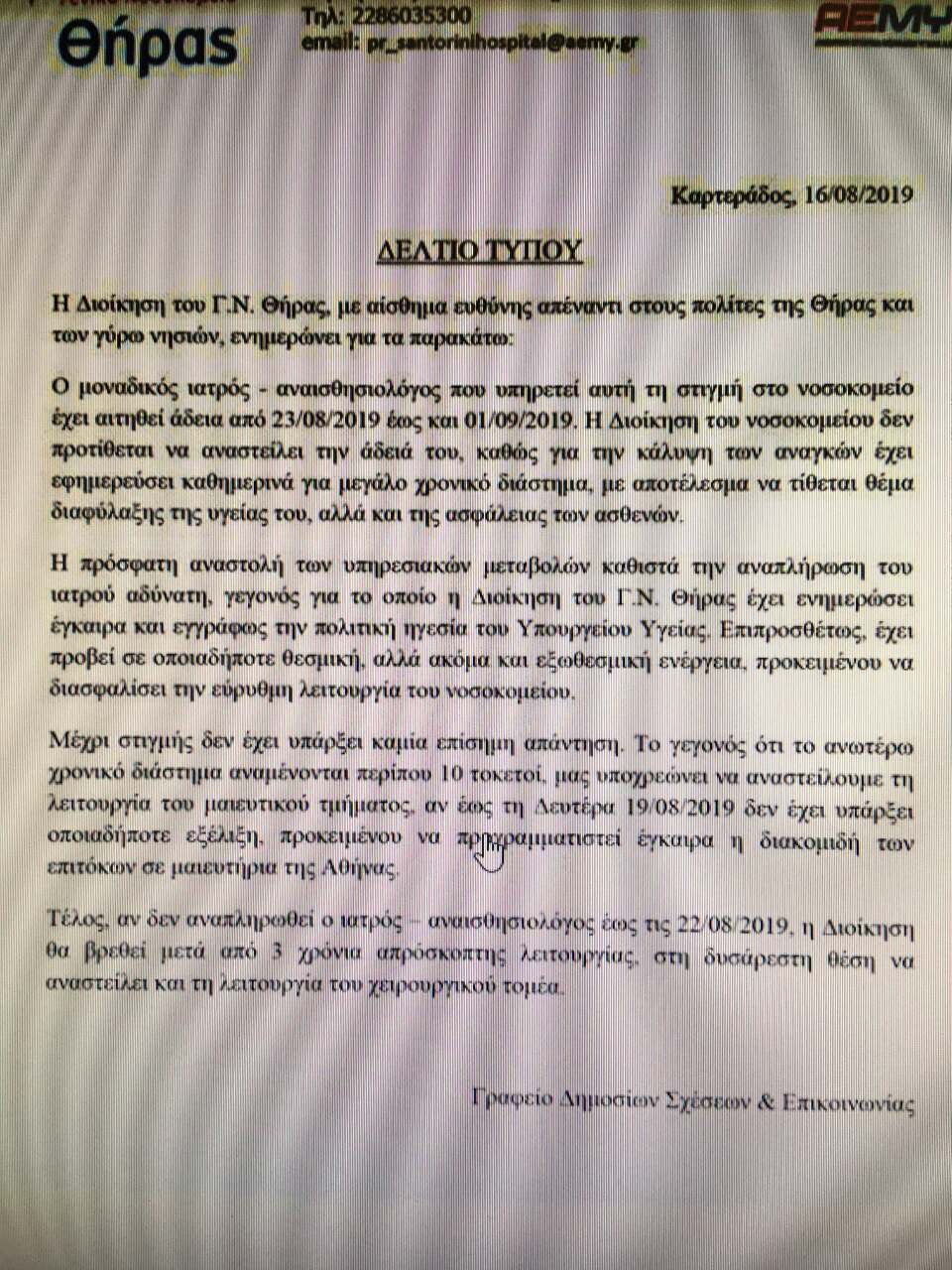 επειδή ο μοναδικός Αναισθησιολόγος παίρνει λίγες ημέρες άδεια τέλος Αυγούστου.