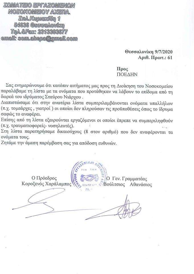 1. Το Σωματείο Εργαζομένων "Ιπποκράτης" του Γενικού Περιφερειακού Νοσοκομείου Πατρών Άγιος Ανδρέας εκφράζει το παράπονό του για το ότι εξαιρέθηκαν 15 και πλέον συνάδελφοί τους από τη δωρεά του επιδόματος του Ιδρύματος Σταύρου Νιάρχου