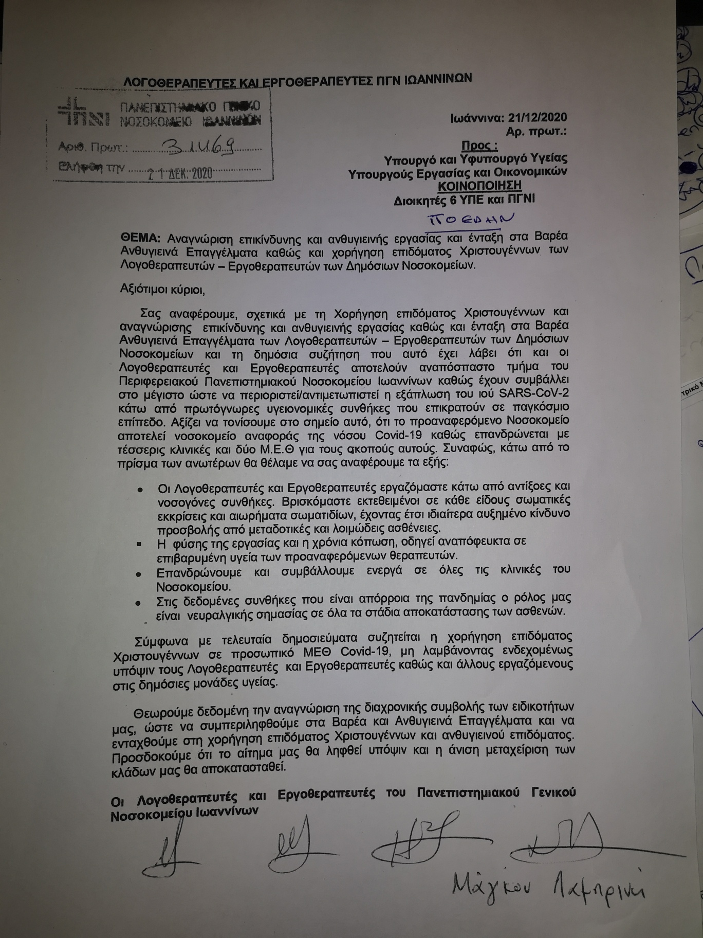 1. Ο Σύλλογος Εργοθεραπευτών και Λογοθεραπευτών του Π.Γ.Ν. Ιωαννίνων με έγγραφο προς τους Υπουργούς Υγείας ζητούν την αναγνώριση της Επικίνδυνης και Ανθυγιεινής εργασίας και την ένταξή τους στα ΒΑΕ καθώς και την χορήγηση επιδόματος Χριστουγέννω. Εργοθεραπευτές και Λογοθεραπευτές του Π.Γ.Ν. Ιωαννίνων